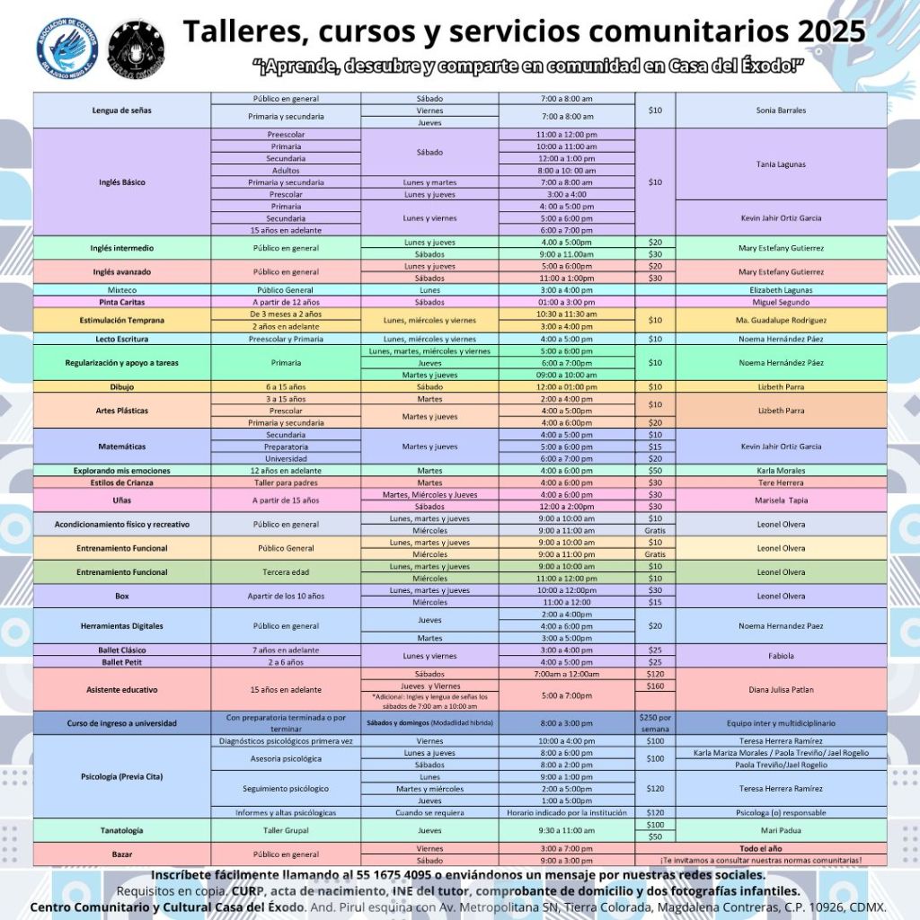 En el Centro Comunitario y Cultural “Casa del Éxodo”, la Asociación de Colonos del Ajusco Medio A.C. impulsa espacios de aprendizaje, acompañamiento y desarrollo integral para niñas, niños, jóvenes, personas adultas y familias del Ajusco Medio. Nuestra oferta está diseñada para fortalecer las capacidades de la comunidad mediante actividades educativas, artísticas, deportivas y psicoemocionales, así como servicios de apoyo que promueven el bienestar y la cohesión social.