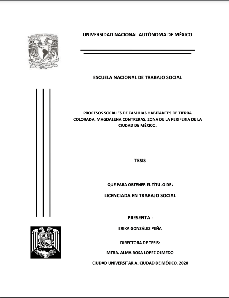Erika González Peña. 2020. Procesos sociales de familias habitantes de Tierra Colorada, Magdalena Contreras, zona de la periferia de la Ciudad de México. Tesis para obtener el grado de licenciatura en Trabajo Social. Universidad Nacional Autónoma de México.