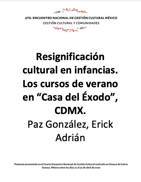Erick Adrián Paz-González. 2020. «Resignificación cultural en infancias. Los cursos de verano en ‘Casa del Éxodo’, CDMX». Repositorio del Observatorio Latinoamericano de Gestión Cultural, México.