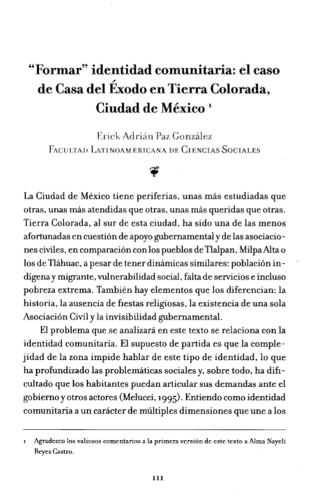 Erick Adrián Paz-González. 2020. «‘Formar’ identidad comunitaria: el caso de Casa del Éxodo en Tierra Colorada, Ciudad de México», en Elvira Hernández Carballido y Sarely Martínez Mendiza (coords.), Fragmentario IV. La vocación intercultural de la Comunicación. Elementum: Pachuca, pp. 111-134.
